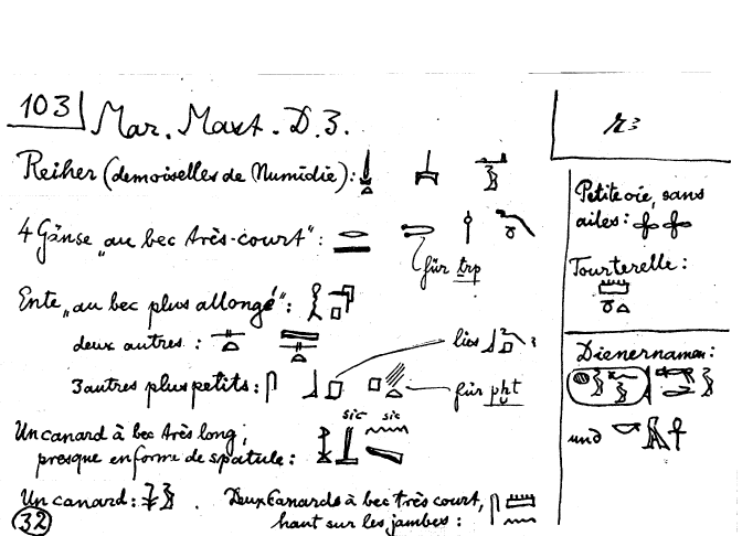 Eine zweite Beobachtung: Der Laut A (Aleph) wird oft nicht geschrieben (sog. Defektivschreibung). Jochem Kahl hat eine lange Liste dieser Fälle erstellt (S. 961-968). Hier sind die Laute ergänzt worden. Kaplony hingegen berücksichtigt sie in seiner Umschrift nicht. So spricht er von px- bzw. HT-Brot.