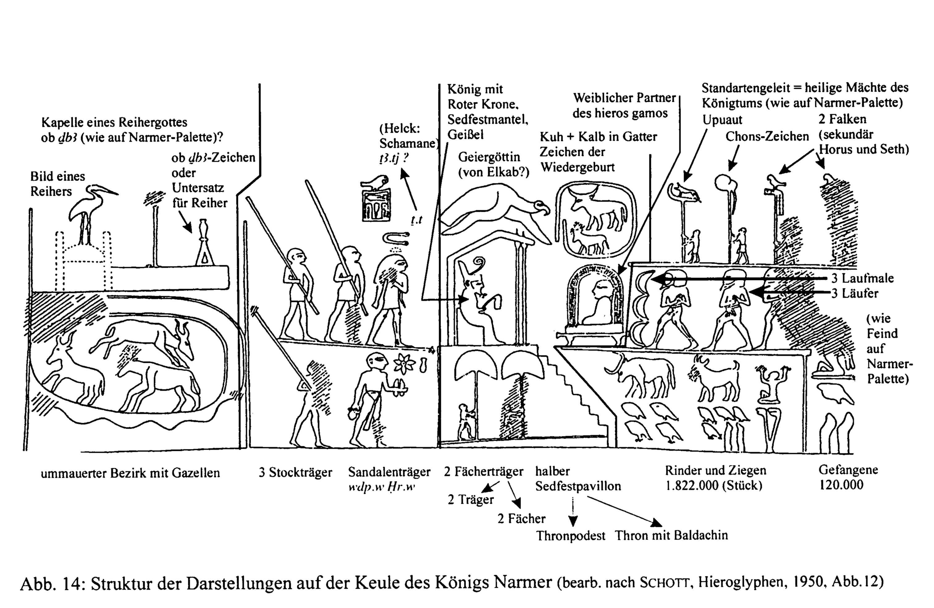 die Narmer-Keule wird diskutiert in Rolf Gundlach, Der Pharao und sein Staat, Darmstadt, 1998, S. 68-73. Das Ergebnis seiner Betrachtungen hat er auch in einer Abbildung zusammengefasst. Diese ist sozusagen eine "Abrollung" der Keule, versehen mit Gundlachs Kommentaren.