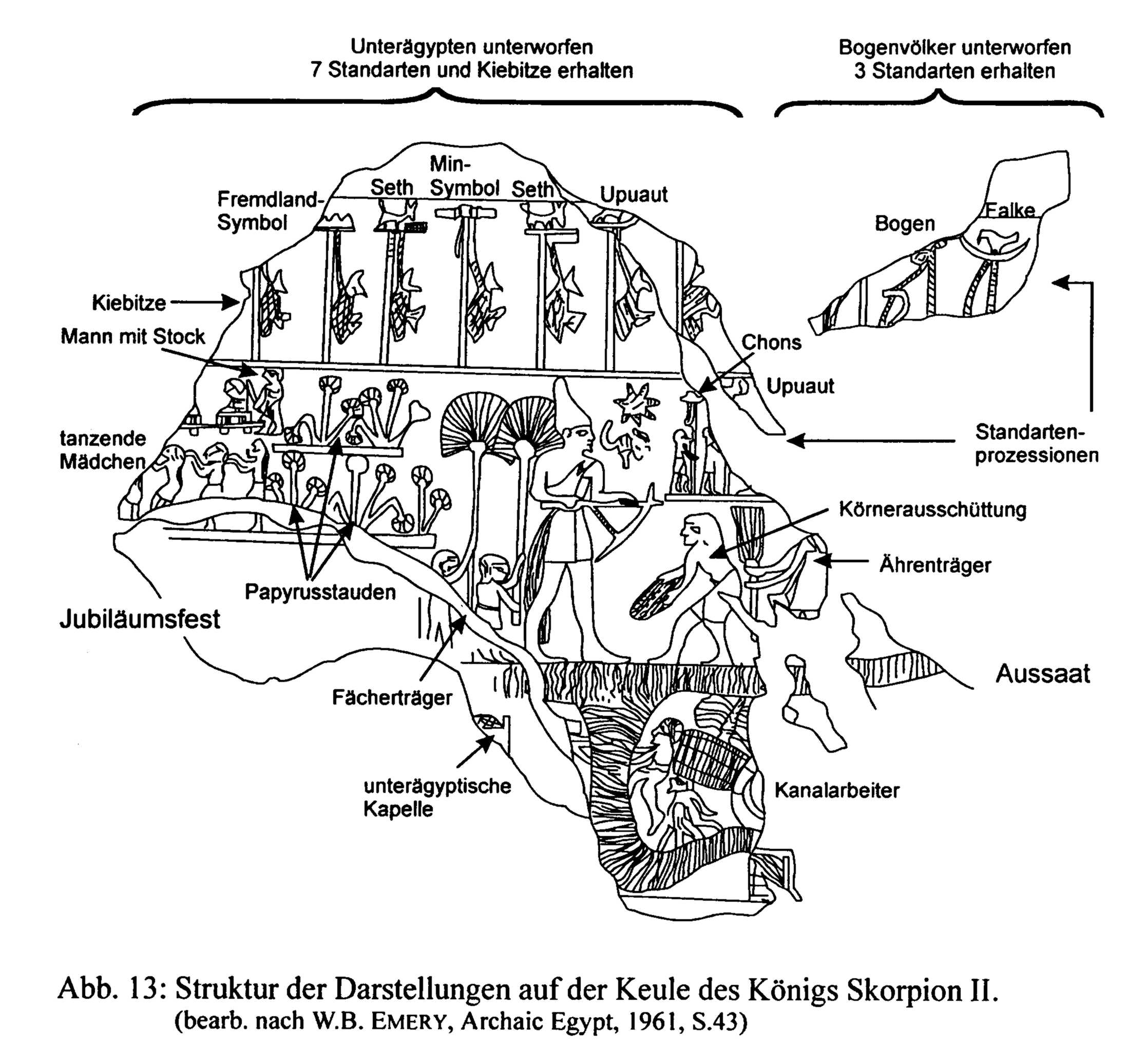 Interessant auch die Interpretation von Gundlach (1998), wonach die auf dem Keulenkopf des Skorpion gezeigten Bauern die zur Bewässerung ihrer Felder benötigten Kanäle ausbessern.