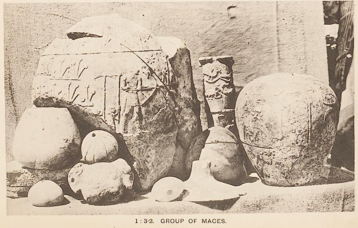Bei erneuter Durchsicht fiel mir dazu nun die Aufnahme in Quibell (1900), Tafel XXV unten auf. Den rechts im Bild befindlichen zweiten Keulenkopf, offenbar jenen des Narmer, hatte ich bislang gar nicht beachtet.