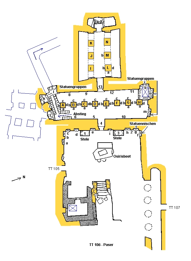 Dekoration Hof a.) - i.) Neun Nischen, jede mit einer Statue des Grabherrn versehen und einige beschriftet. Die Statuen d.), e.) und f.) zeigen Paser als Osiris.