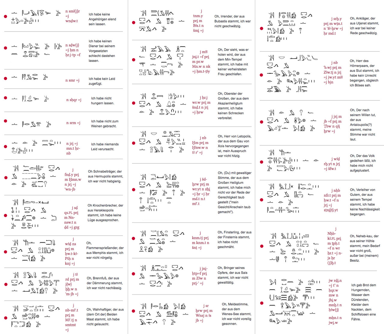 Du hast das sog. "Negative Sündenbekenntnis" angesprochen: Das ist Tb 125. Geh also auf die entsprechende Webseite und klicke "Sätze des Textes" an. Dann erhältst Du abschnittsweise - auf 24 Seiten - die Hieroglyphen, die Umschrift und eine deutsche Übersetzung. Die zugehörigen Fotos des Textes sind auf den Blättern 23 und 24. Der Text ist retrograd geschrieben: Obwohl die Hieroglyphen nach rechts blicken, sind die Spalten von links nach rechts zu lesen, entgegen der sonst üblichen Norm. Das findet man in den Jenseitstexten oft. Das negative Sündenbekenntnis wird zweimal gesprochen, beim zweitenmal an die 42 Totenrichter gerichtet.